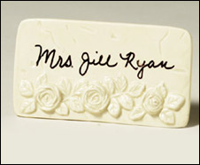 The Princess Rose is a very romantic PlaceTile® place card inspired by a stylish 1920s socialite who created her own personal ceramic place card decorated with a single rose and her signature engraved in raised gold. She always used the place card at her table, and had it sent ahead by butler to secure her place at the dining table where she would be a guest that evening.