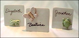 These whimsical Tree Frogs and Sea Turtles are available on our erasable ceramic place cards, called PlaceTiles®, and on our very popular erasable MenuTiles. Each little frog or turtle is embossed and hand painted on the PlaceTile to create more character. These are especially fun to set your tables with at a garden luncheon, tea, or childrens party. Frog and turtle collectors love them too! |